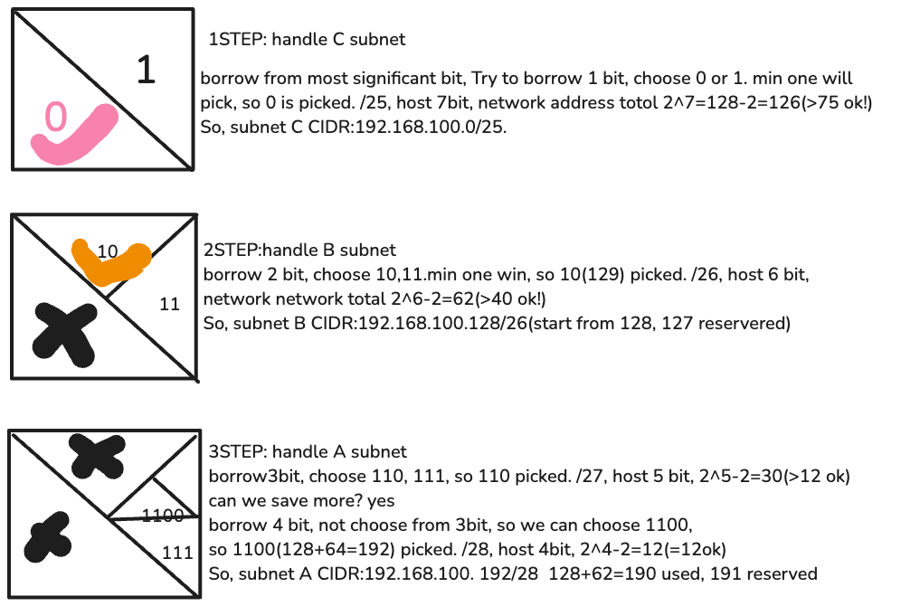 SubnetA -> 40 hosts needed -> host bits= 7(2^6-2=62 hosts) -> CIDR /25(32-6=26) -> subnet mask: 255.255.255.192(25=8+8+8+2) borrow 2 bit -> Final CIDR 192.168.100.128/26 -> Usable IP range[192.168.100.129~192.168.100.190(128+62)] (reversed:192.168.100.128, broadcast:192.168.191, last octet borrow 2)